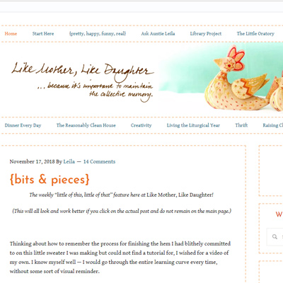 "After many unfulfilling phone conversations in which we mothers and daughters attempted (with little success) to describe with any accuracy our ongoing projects and domestic triumphs, this blog was born. We found that we also have something to say about making a home and maintaining the collective memory."